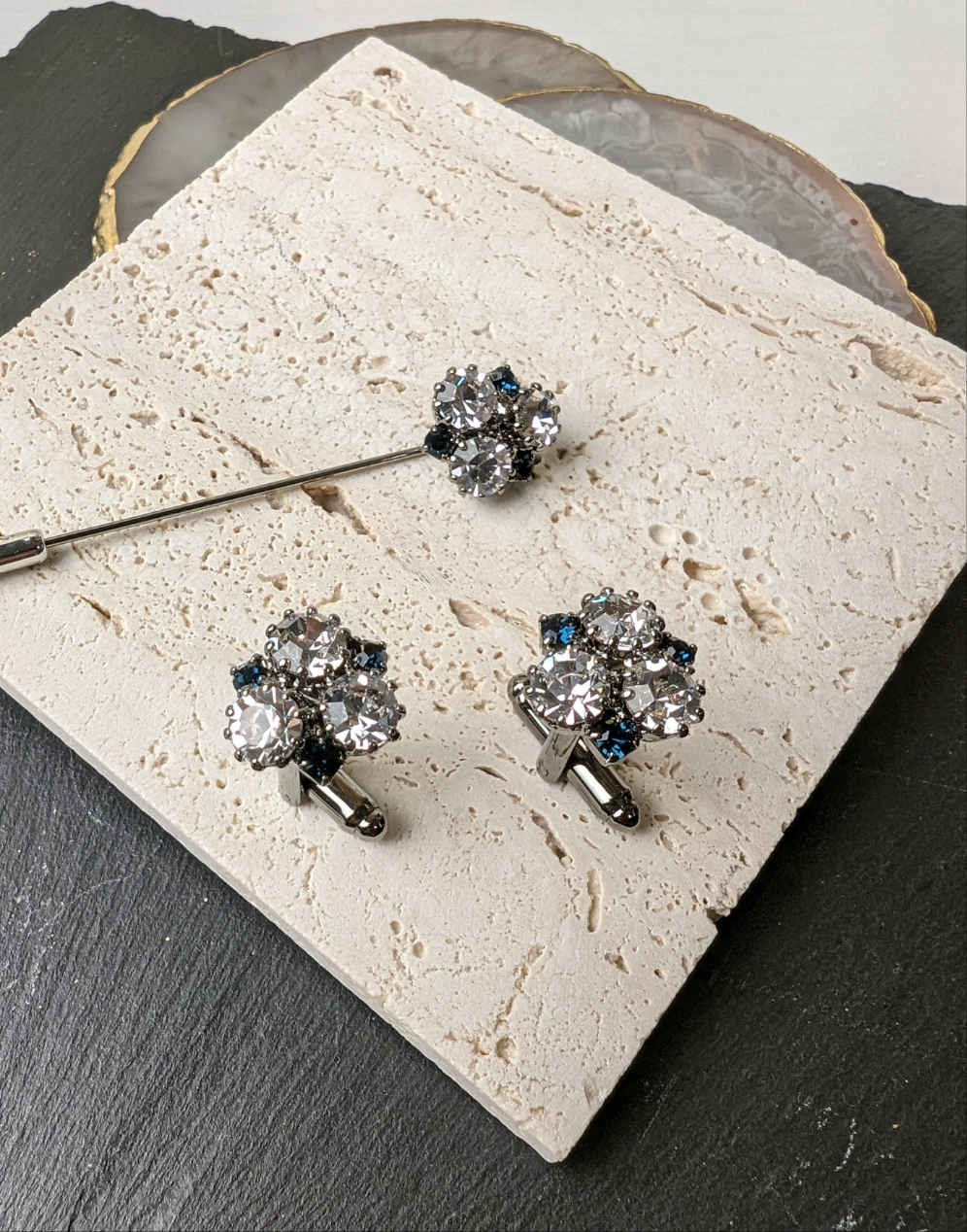 Gemelli da polso per camicia e spilla abbinata, in strass Swarovski e Preciosa, con lega in stagno, base ottone, placcato rodio, nichel free.