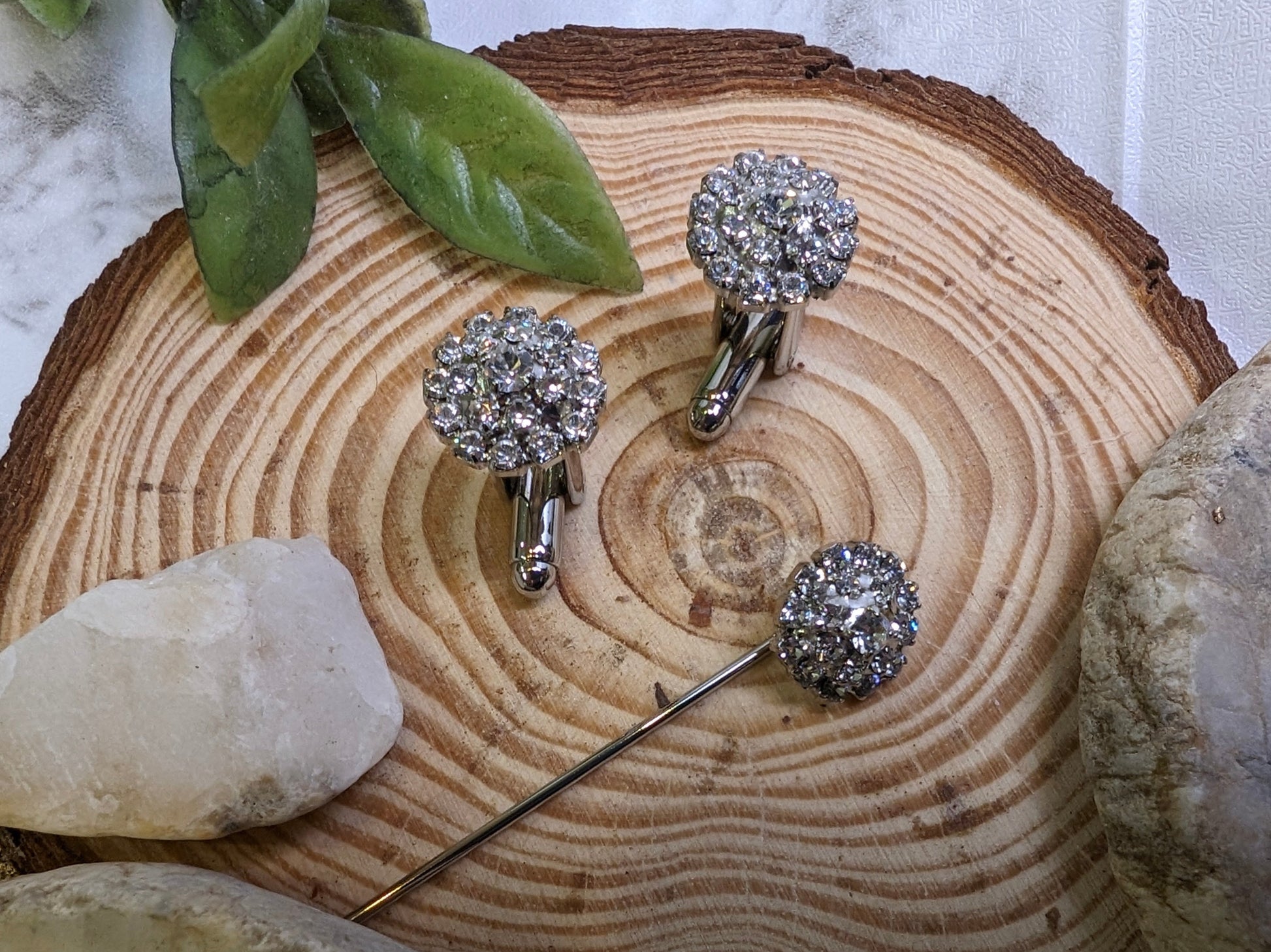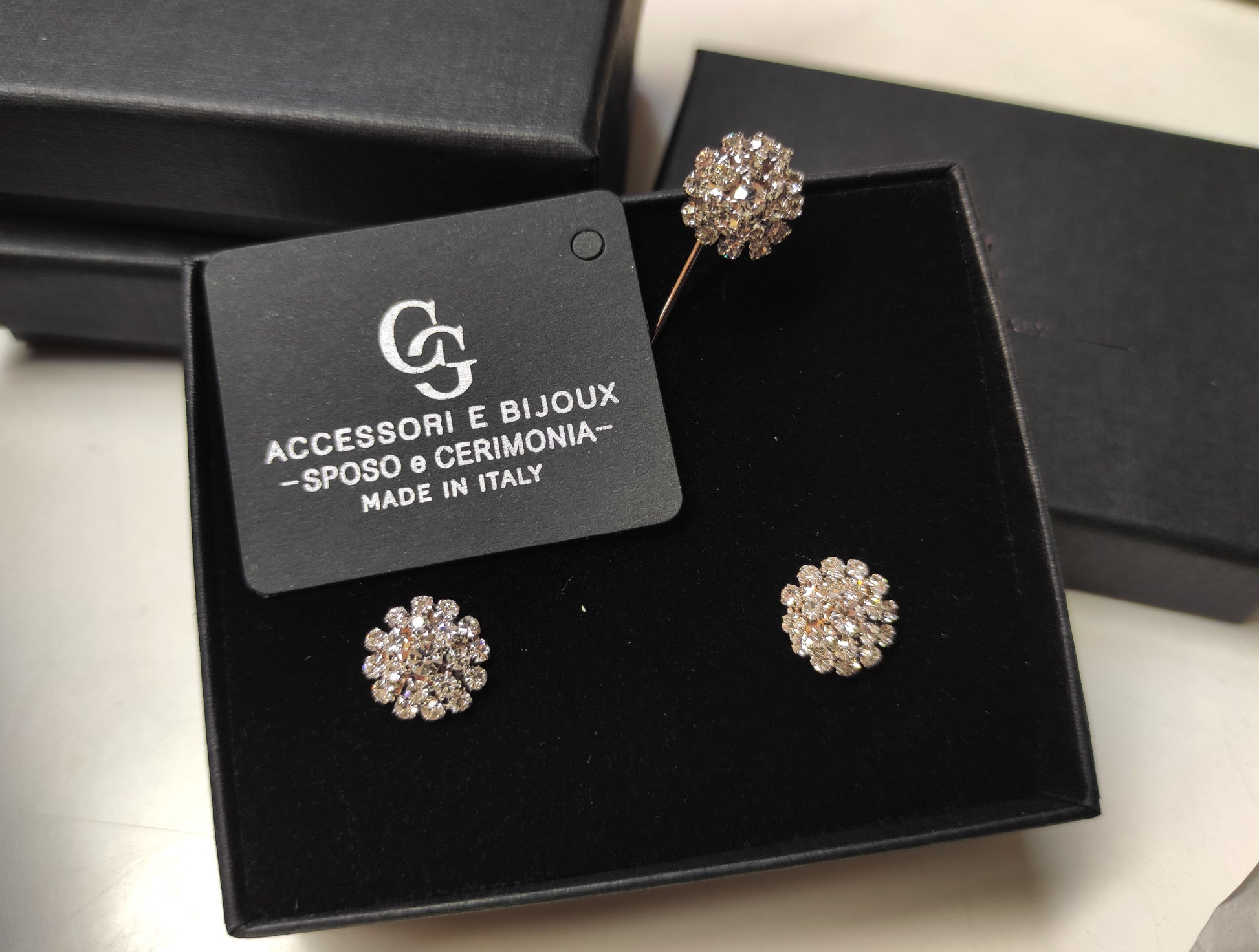 Gemelli da polso per camicia e spilla abbinata, in strass Swarovski, con lega in stagno, base ottone, placcato rodio, nichel free.