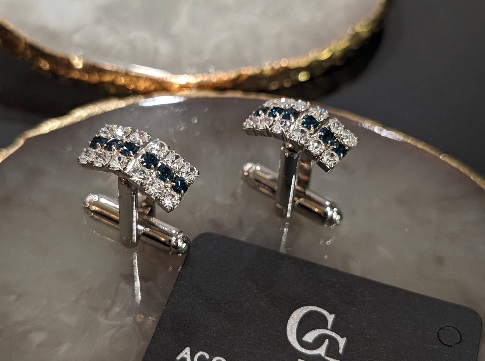 Gemelli da polso per camicia e spilla abbinata, in strass Swarovski e Preciosa, con lega in stagno, base ottone, placcato rodio, nichel free.