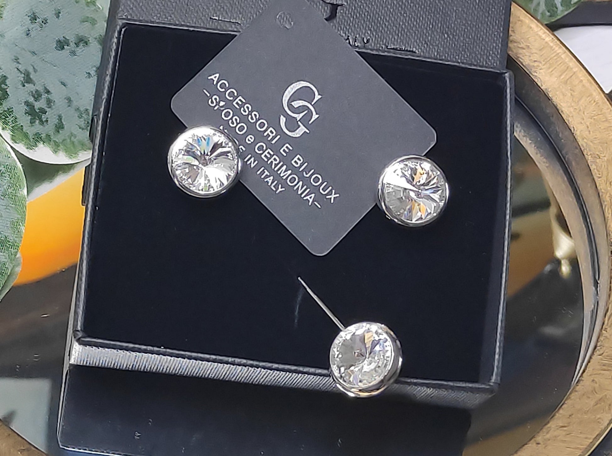Gemelli da polso per camicia e spilla abbinata, in strass Swarovski e Preciosa, con lega in stagno, base ottone, placcato rodio, nichel free.