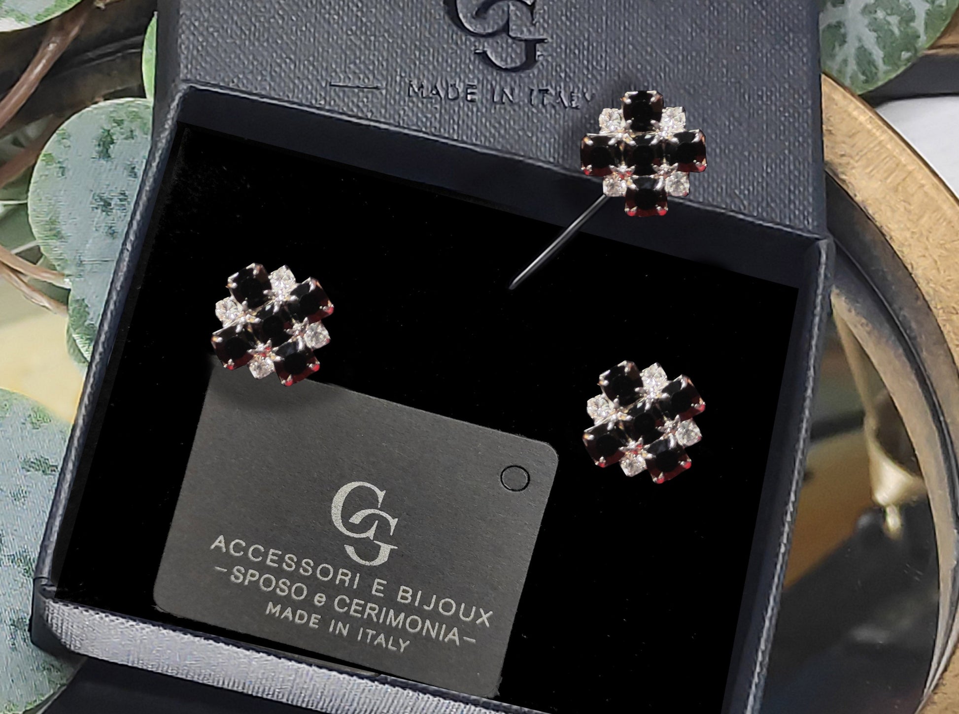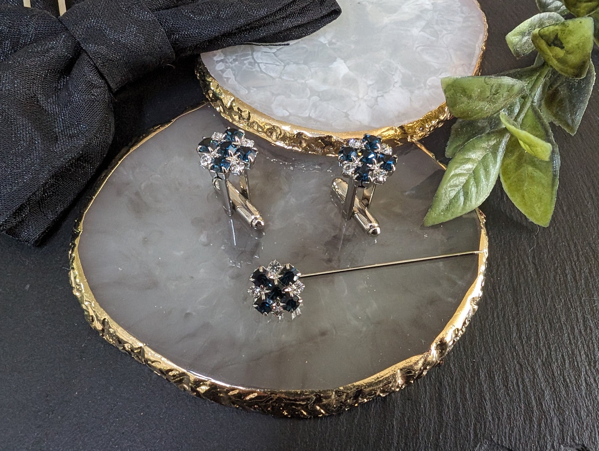 Gemelli da polso per camicia e spilla abbinata, in strass Swarovski e Preciosa, con lega in stagno, base ottone, placcato rodio, nichel free.