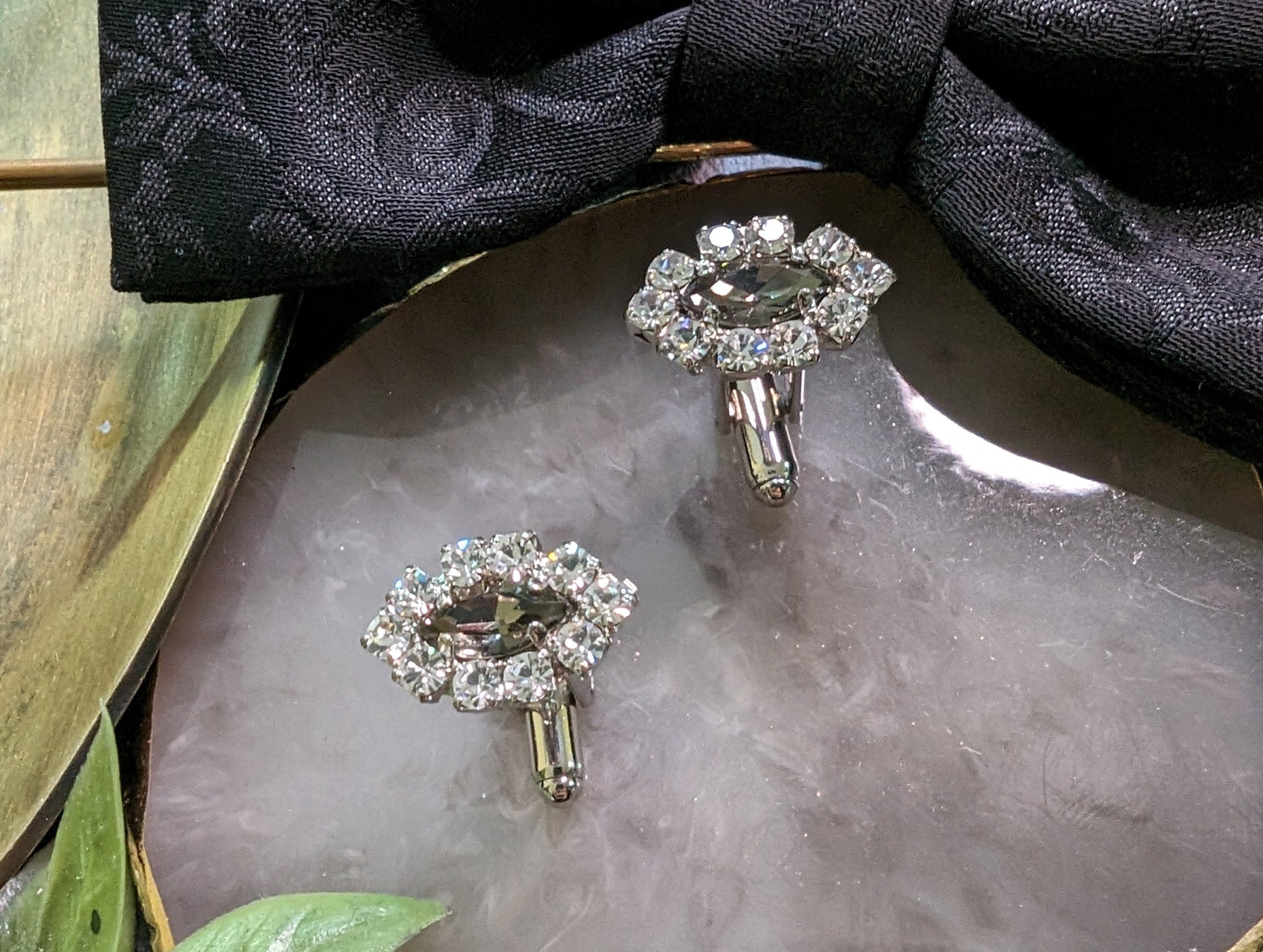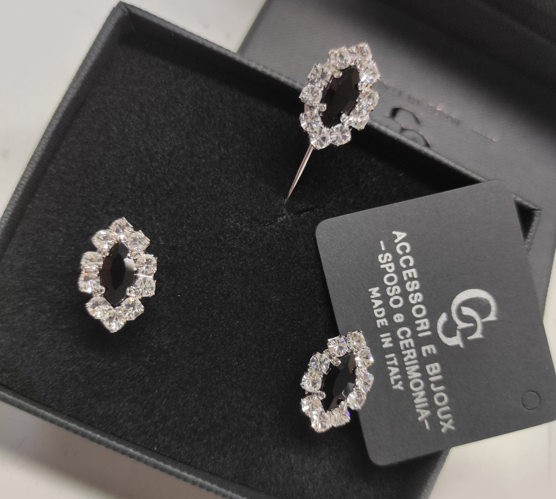Gemelli da polso per camicia e spilla abbinata, in strass Swarovski e Preciosa, con lega in stagno, base ottone, placcato rodio, nichel free.