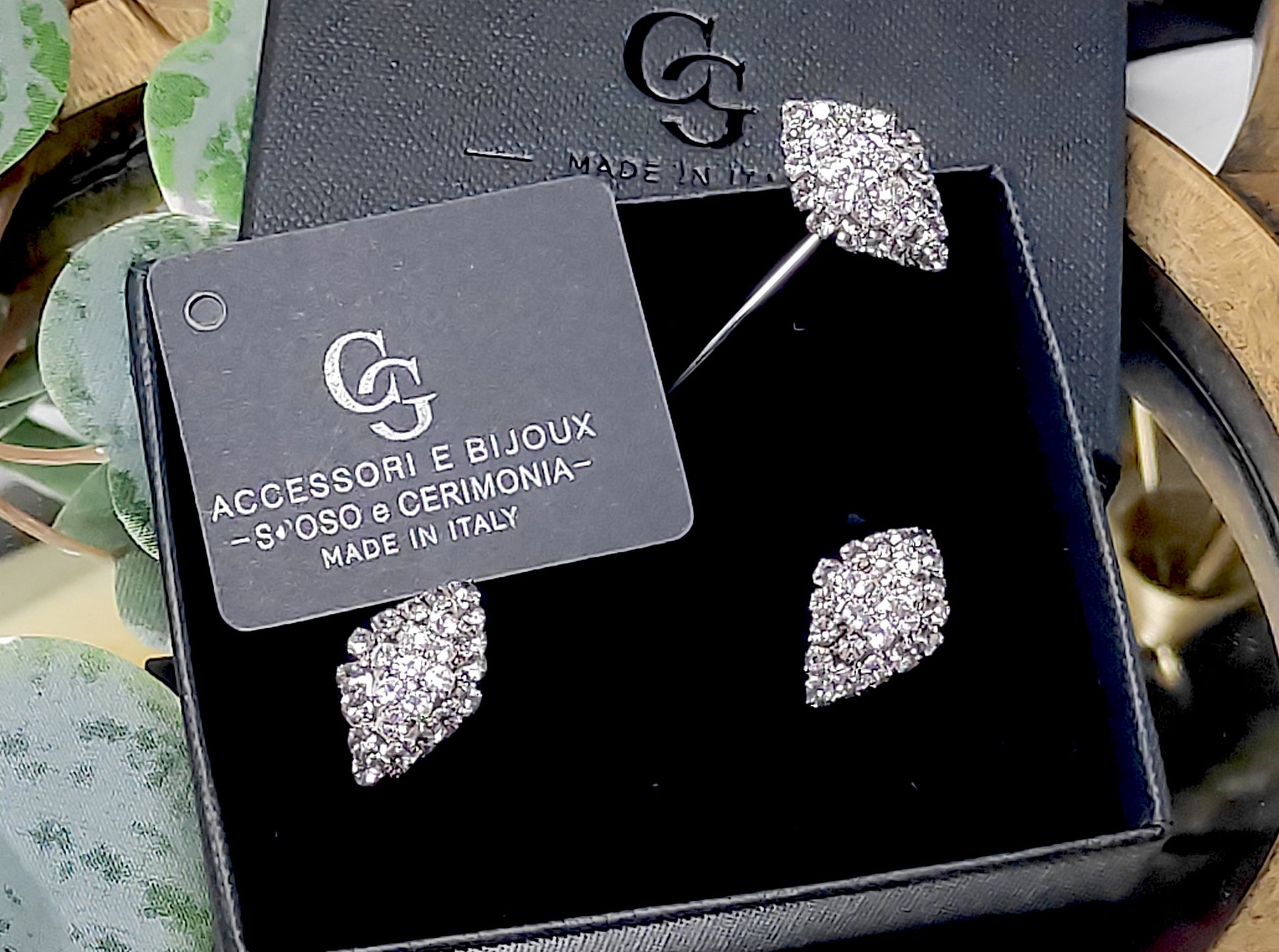 Gemelli da polso per camicia e spilla abbinata, in strass Swarovski e Preciosa, con lega in stagno, base ottone, placcato rodio, nichel free.
